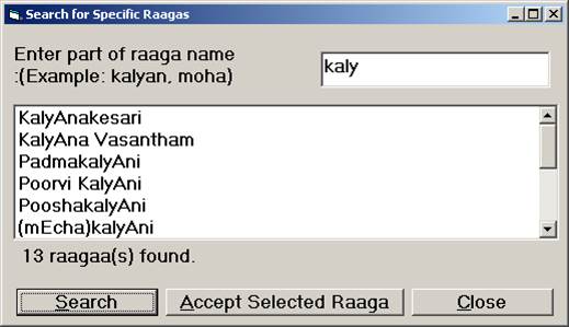 Search... Search for a raga – you can enter part of the raga name in the search window. A List box will show – raga names that contains the search text. You can select a raga from that list by Clicking the “Accept the Selected Raaga”